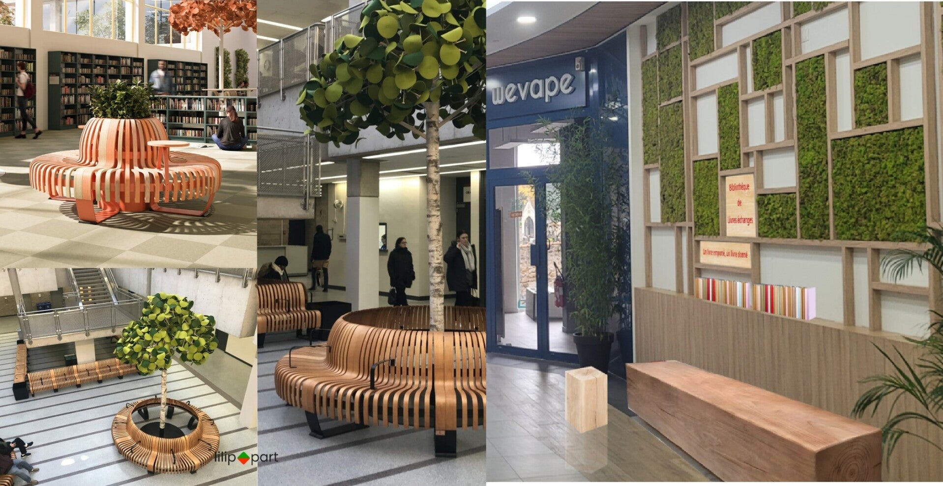 Voilà des idées et des choix de mobilier urbain pour le centre commercial de Garches : ces meubles sobres et élégants peuvent apporter un coté intime et douillet aux clients qui se baladent dans les magasins.